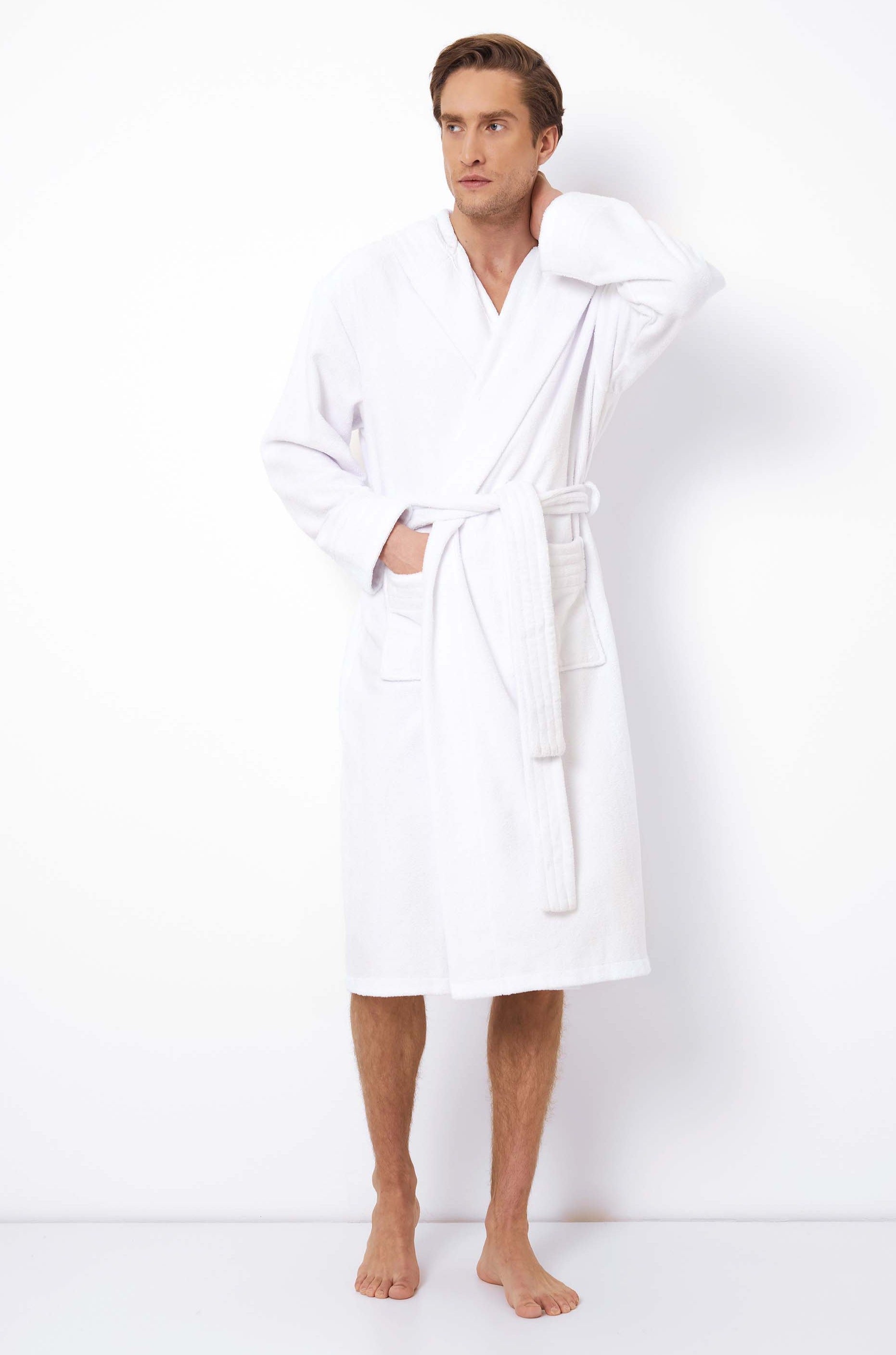 - The bathrobe is decorated with stitching on sleeves, pockets, and waistband.