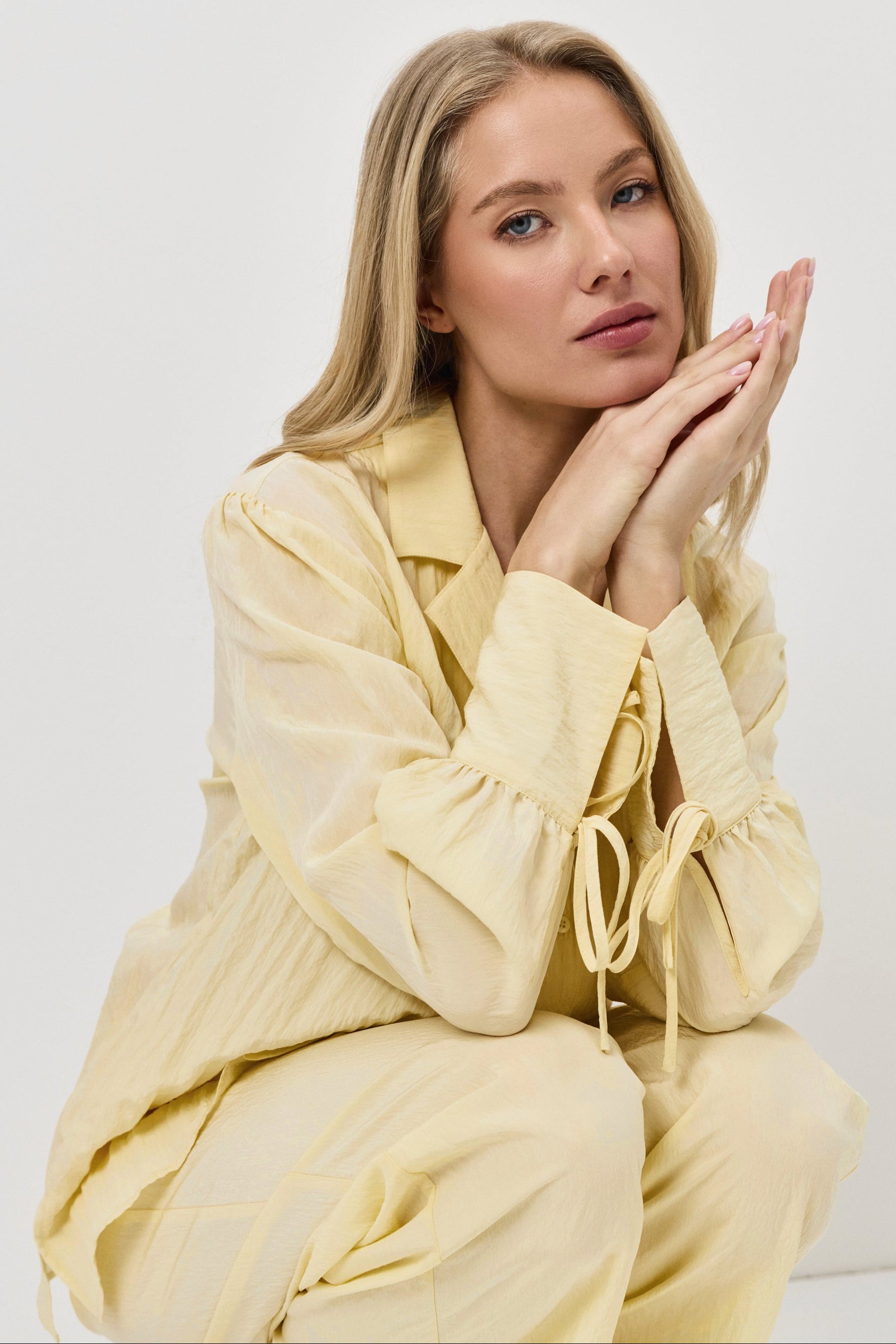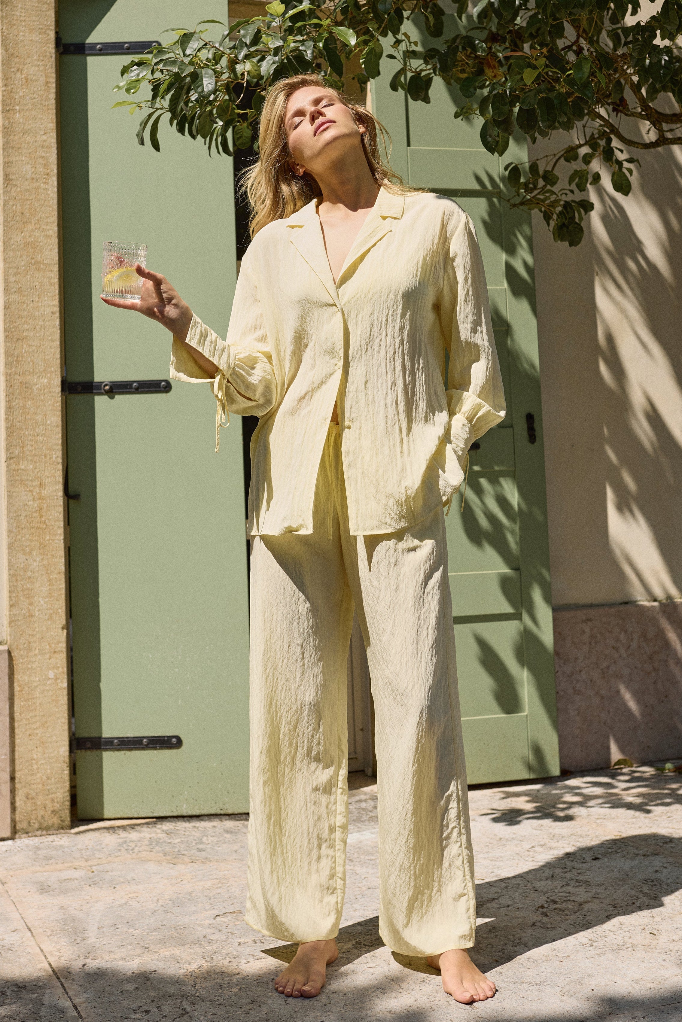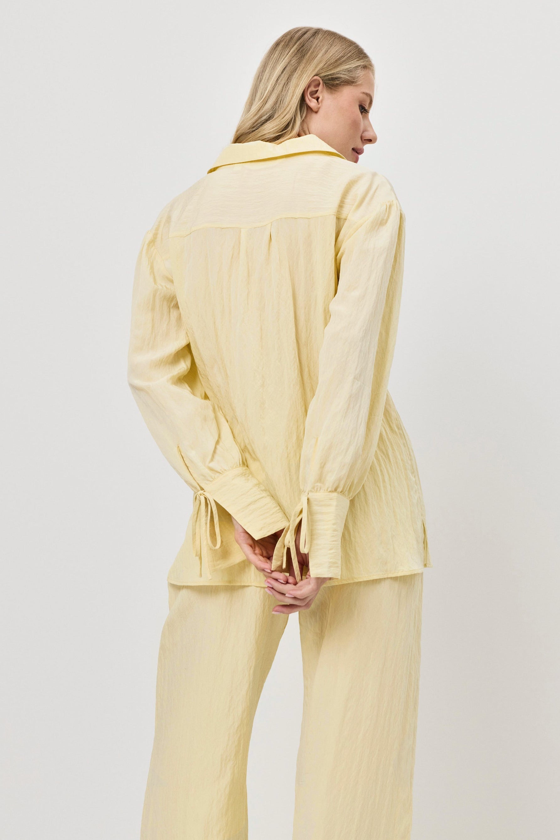 • Presented in a warm butter yellow shade that enhances its breezy silhouette.
