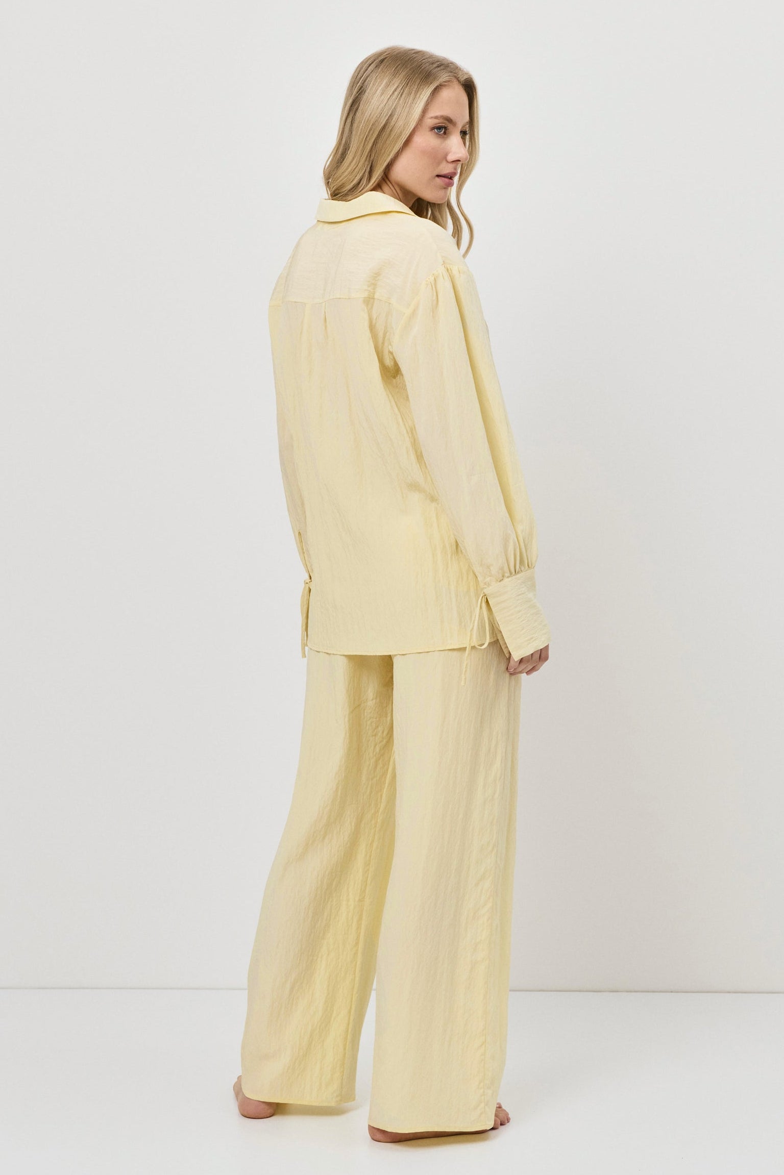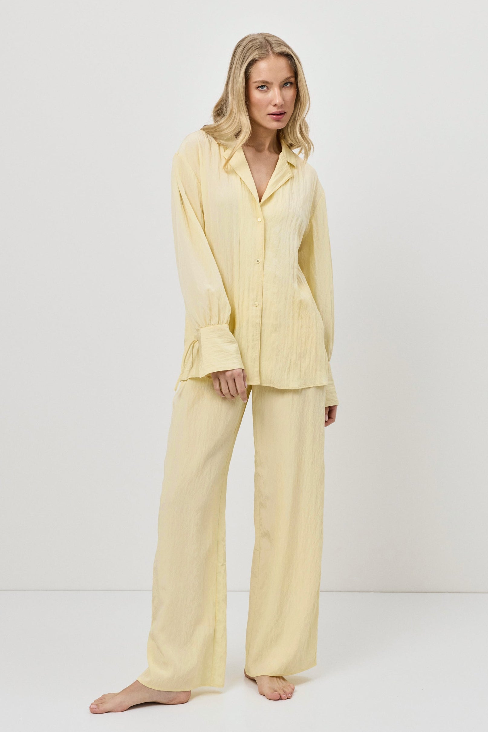 • Matching wide-leg pants with side pockets and an adjustable drawstring waistband.