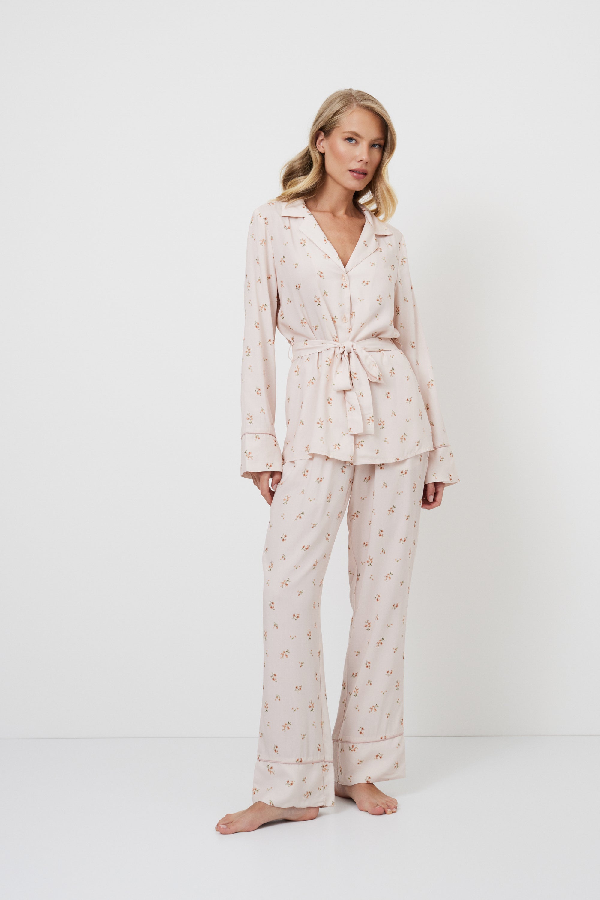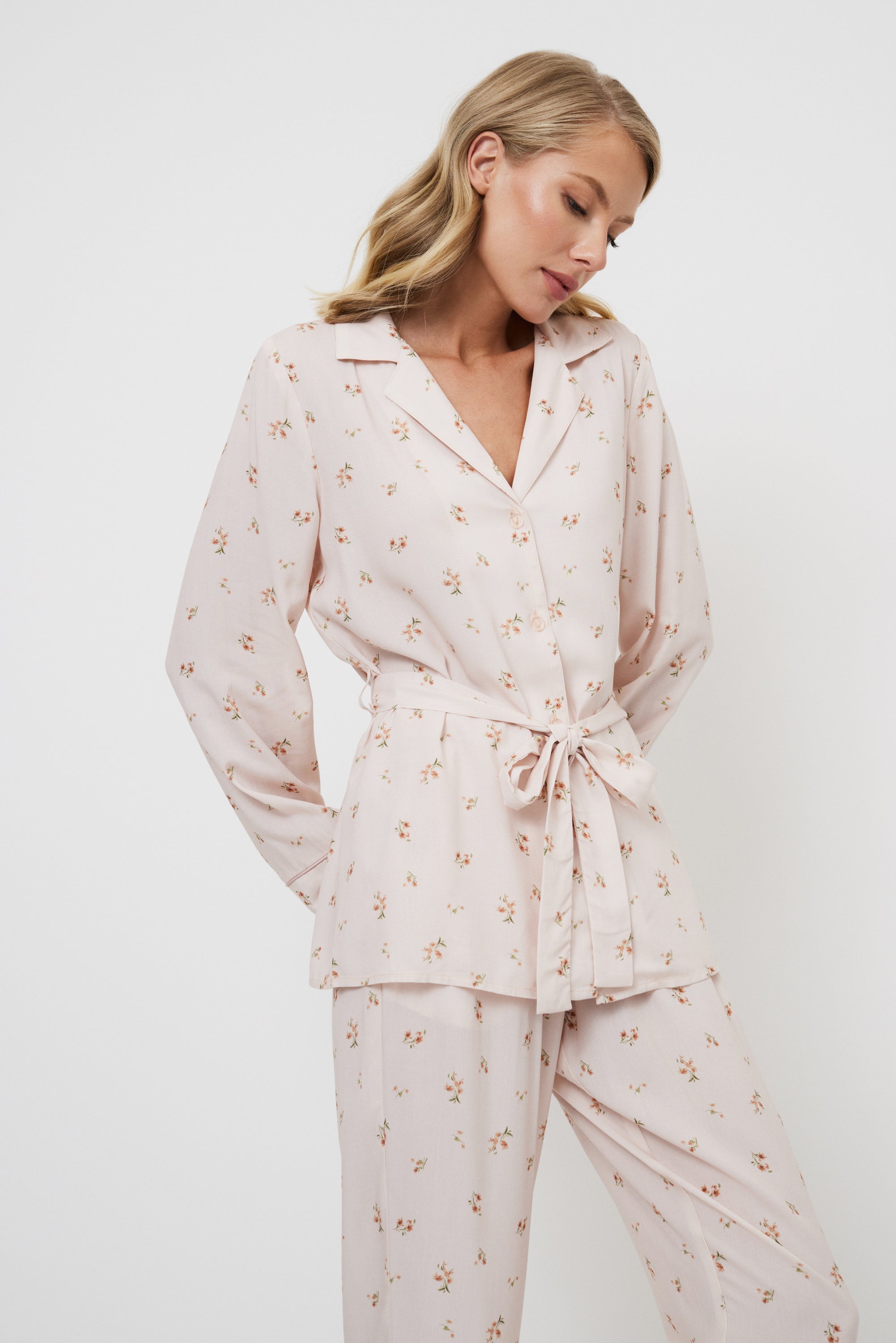 - Crafted from lightweight viscose in a delightful pink floral pattern.