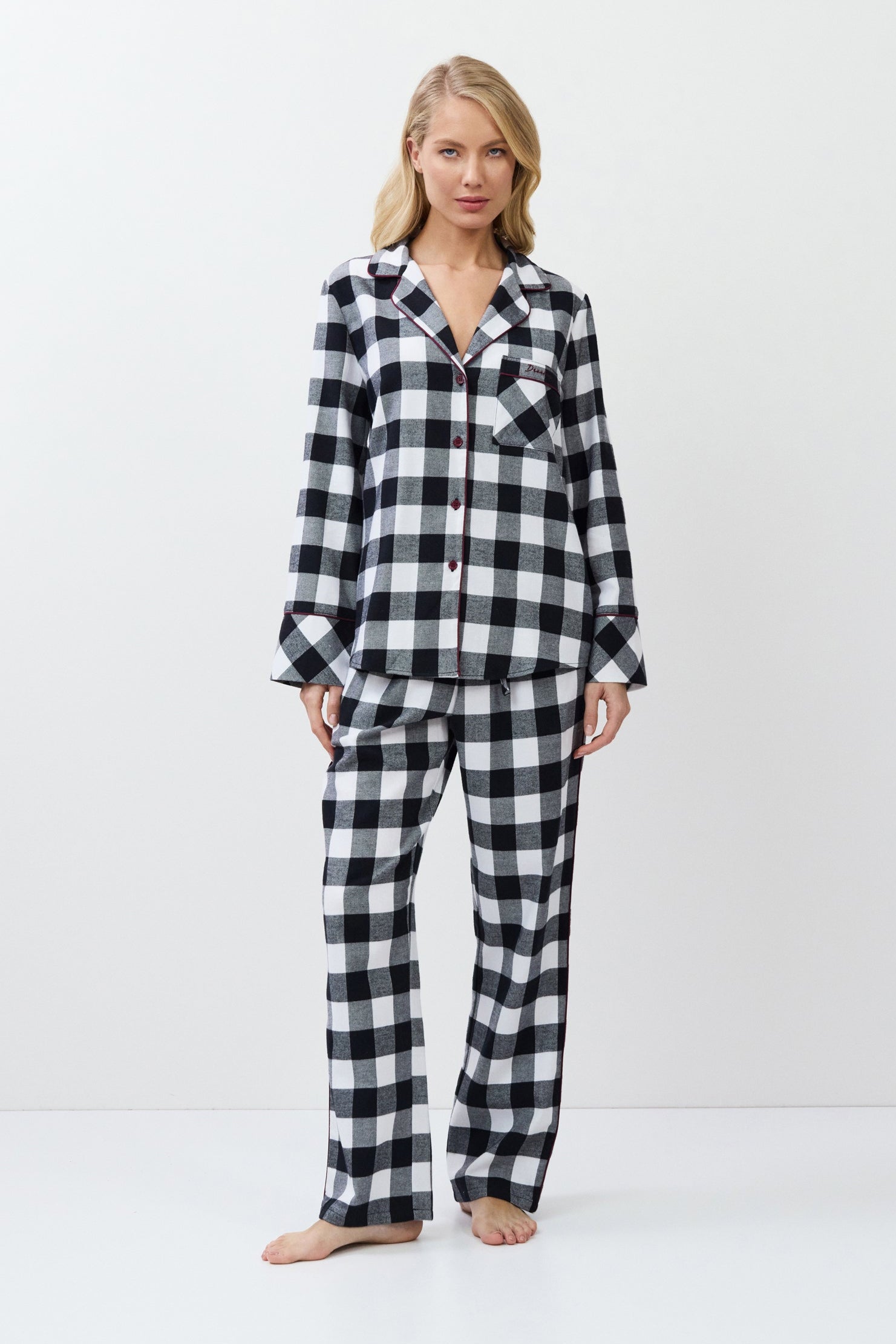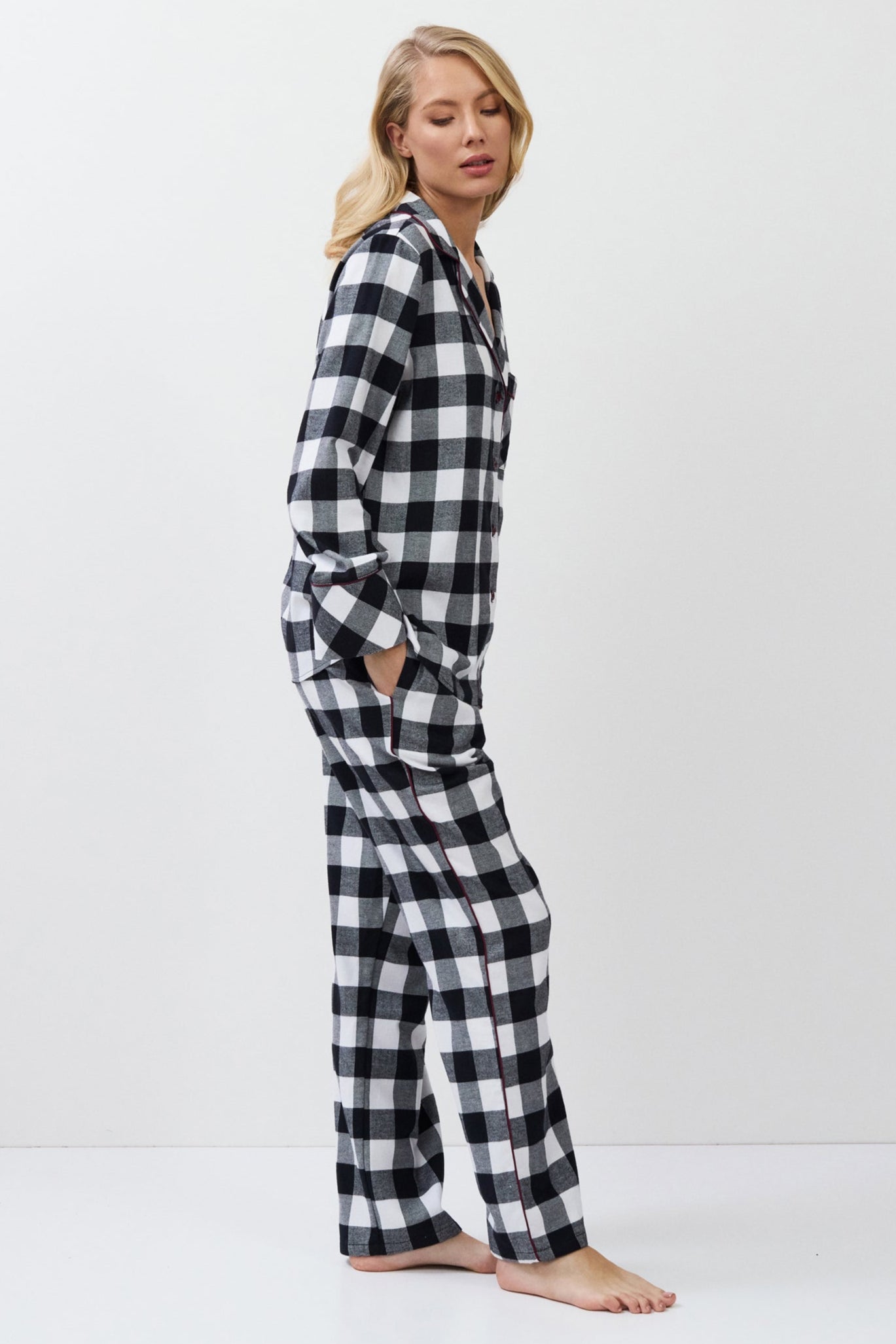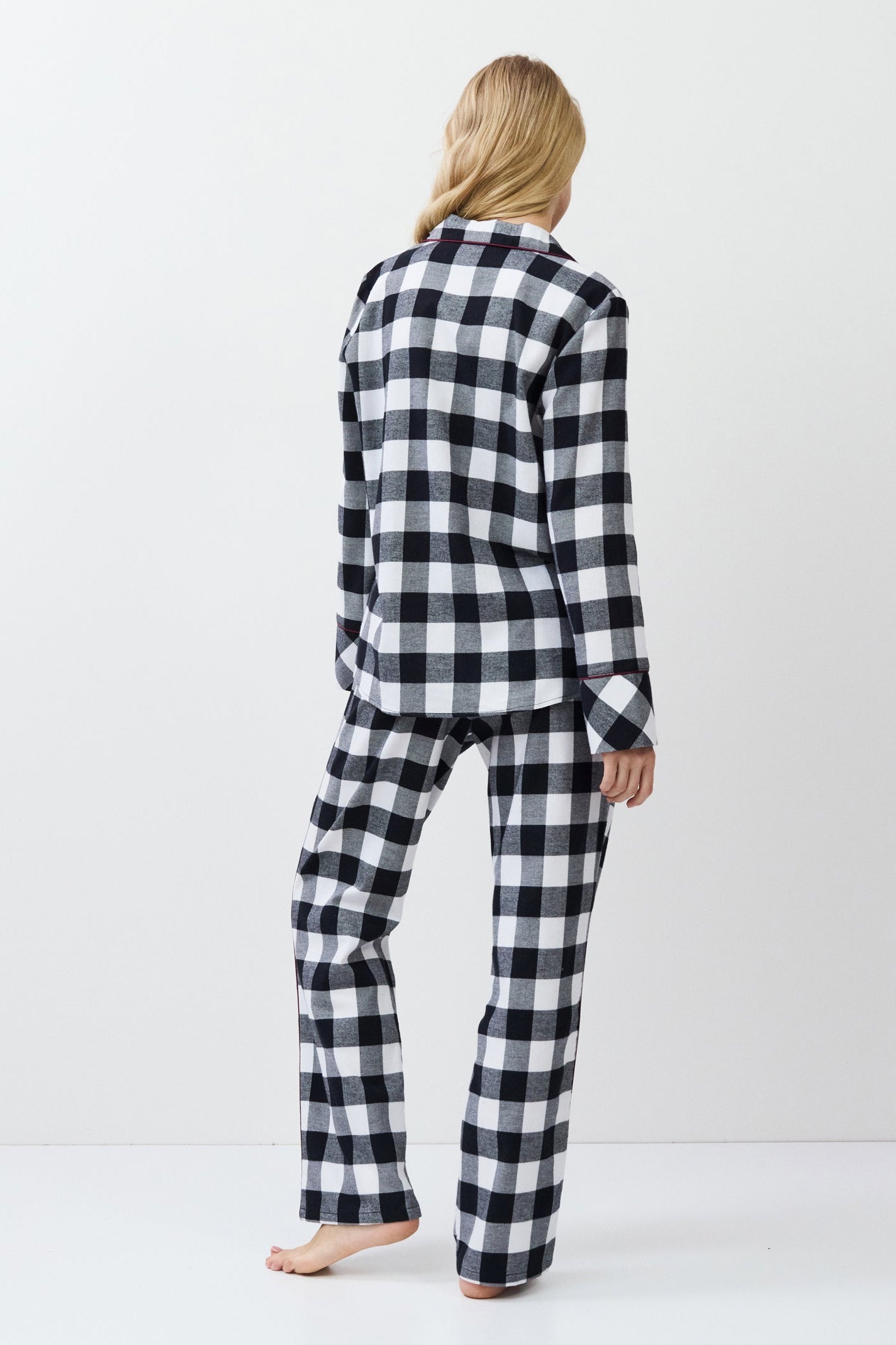 Black and white checkered pajamas with contrasting burgundy color piping accents.