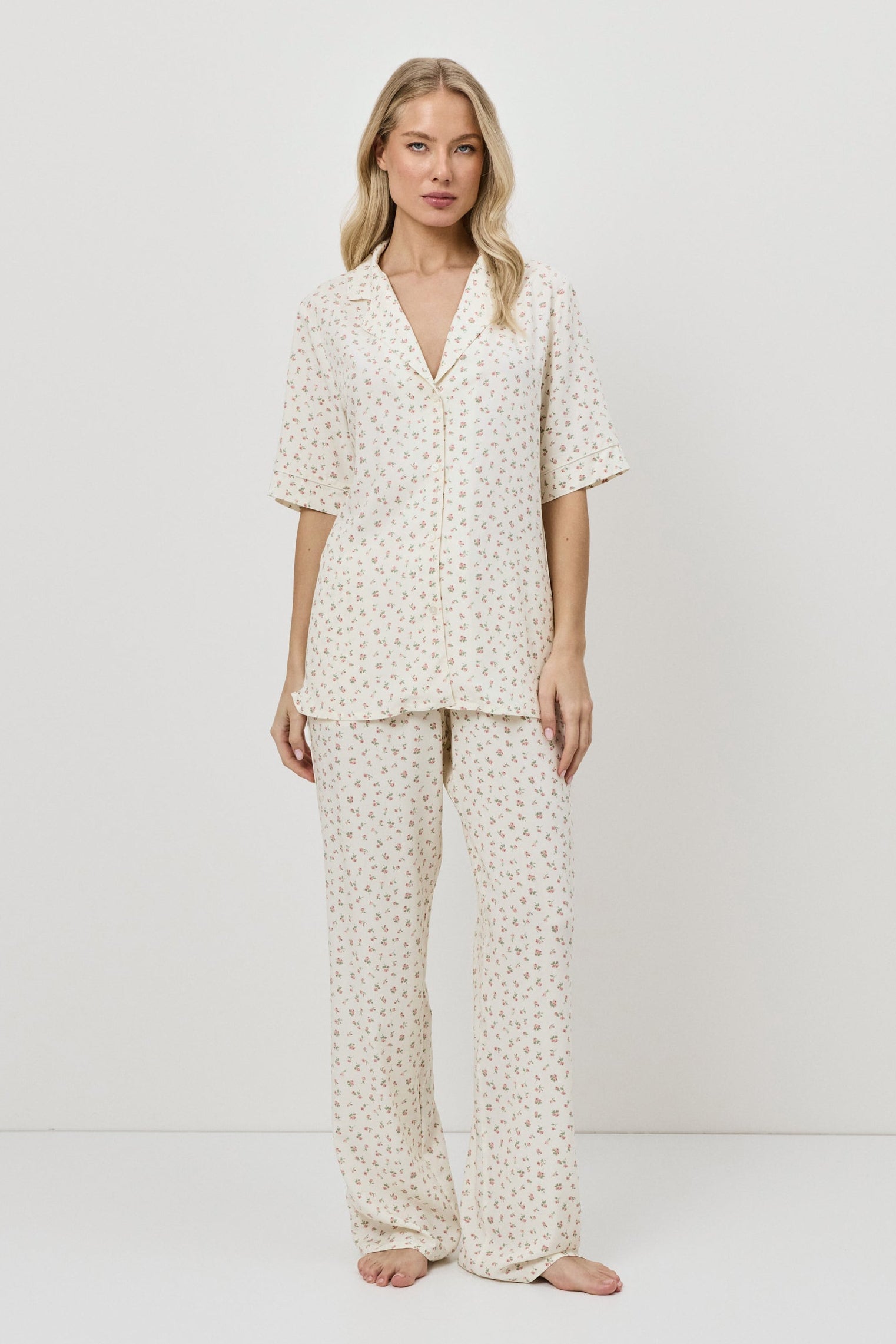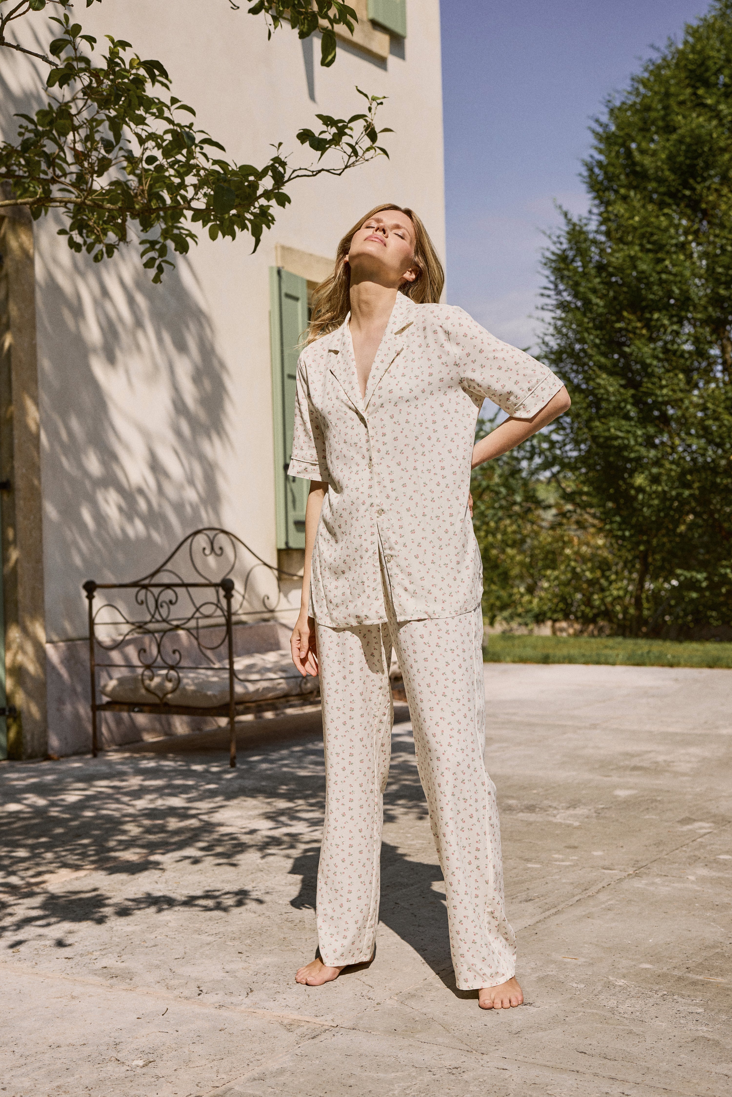 A breezy classic with a vintage charm, this floral pajama set brings softness and lightness to your evenings.