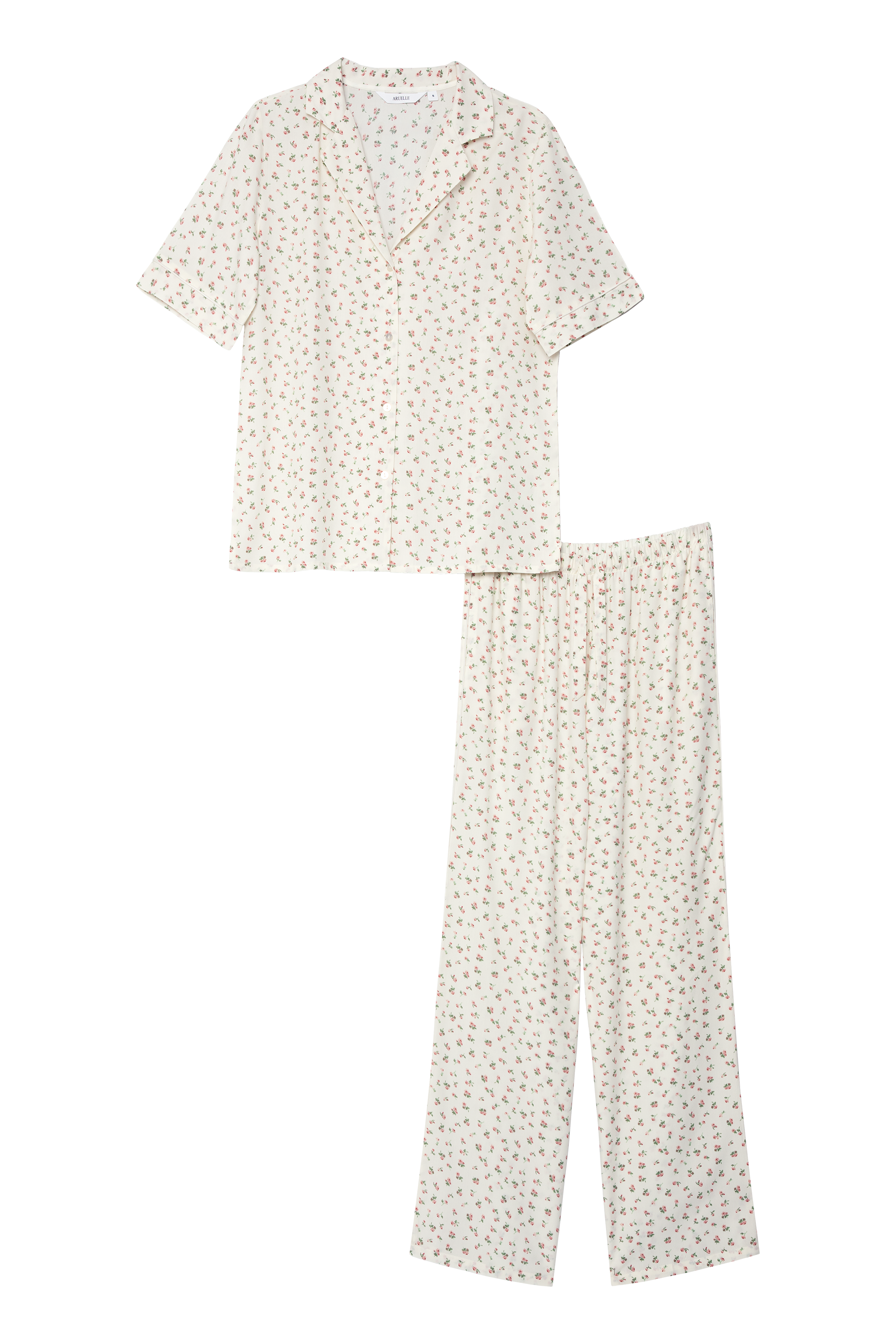 • The set features a short-sleeve button-up shirt and full-length pants.