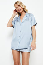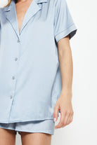 Essy collection invites you to indulge in luxurious comfort and contemporary style, where every detail speaks of timeless charm. This pajama set, exquisitely crafted from satin with a silky finish, displays an elegant muted blue geometric pattern. The short-sleeved, button-down top is designed with a v-neckline collar, adding a refined touch of sophistication. The sleeves are elegantly accented with muted solid blue tapes at the cuffs, providing a unique and stylish flair. To complement the top, the classic-cut shorts feature a waist tie adorned with gold embellishments, and are further enhanced by decorative solid color tape along the sides. This set embodies a perfect blend of contemporary style and enduring elegance, making it an ideal choice for those who appreciate both comfort and fashion.