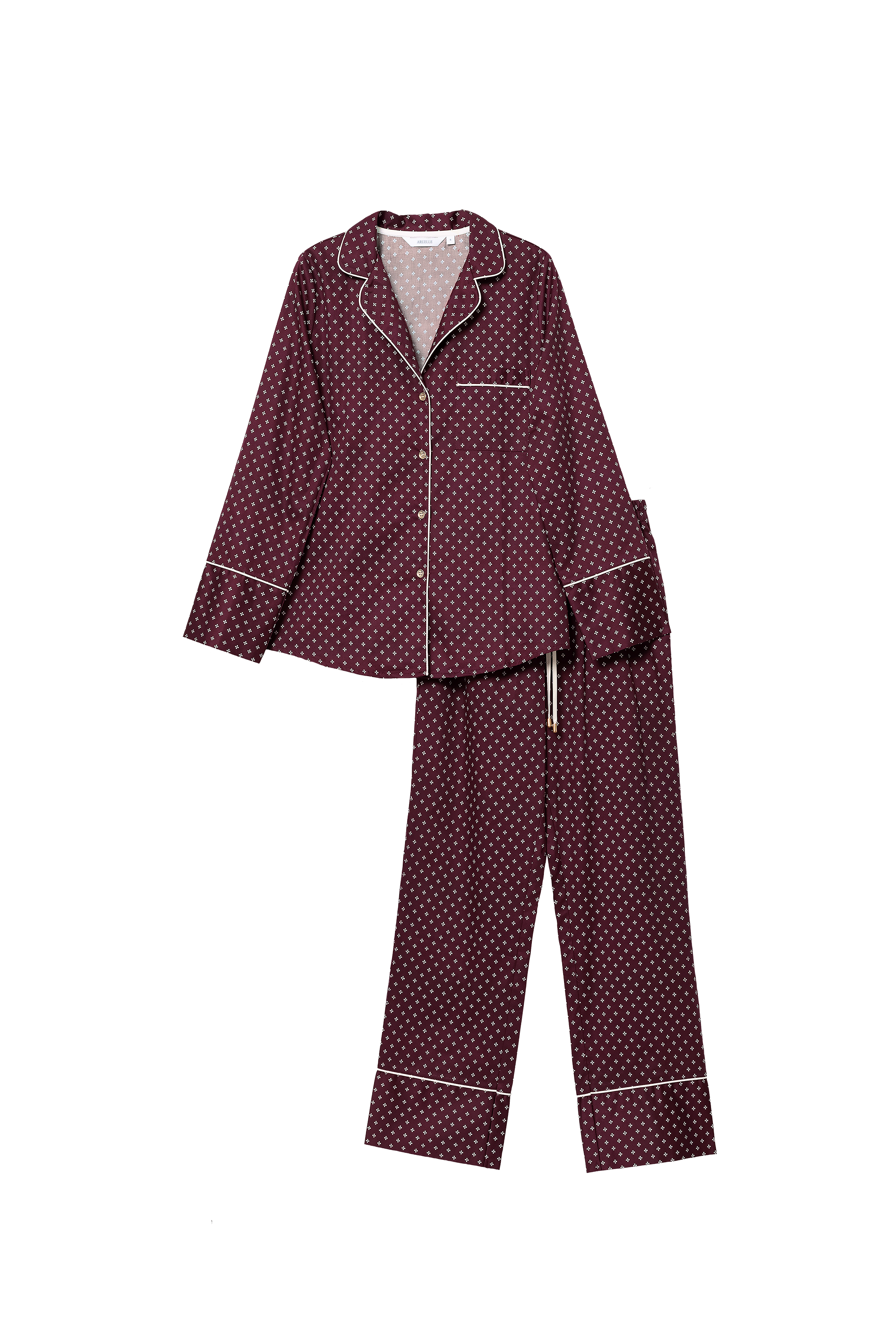 - Piping details adorn the cuffs, pockets, neckline, and pants.