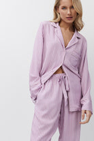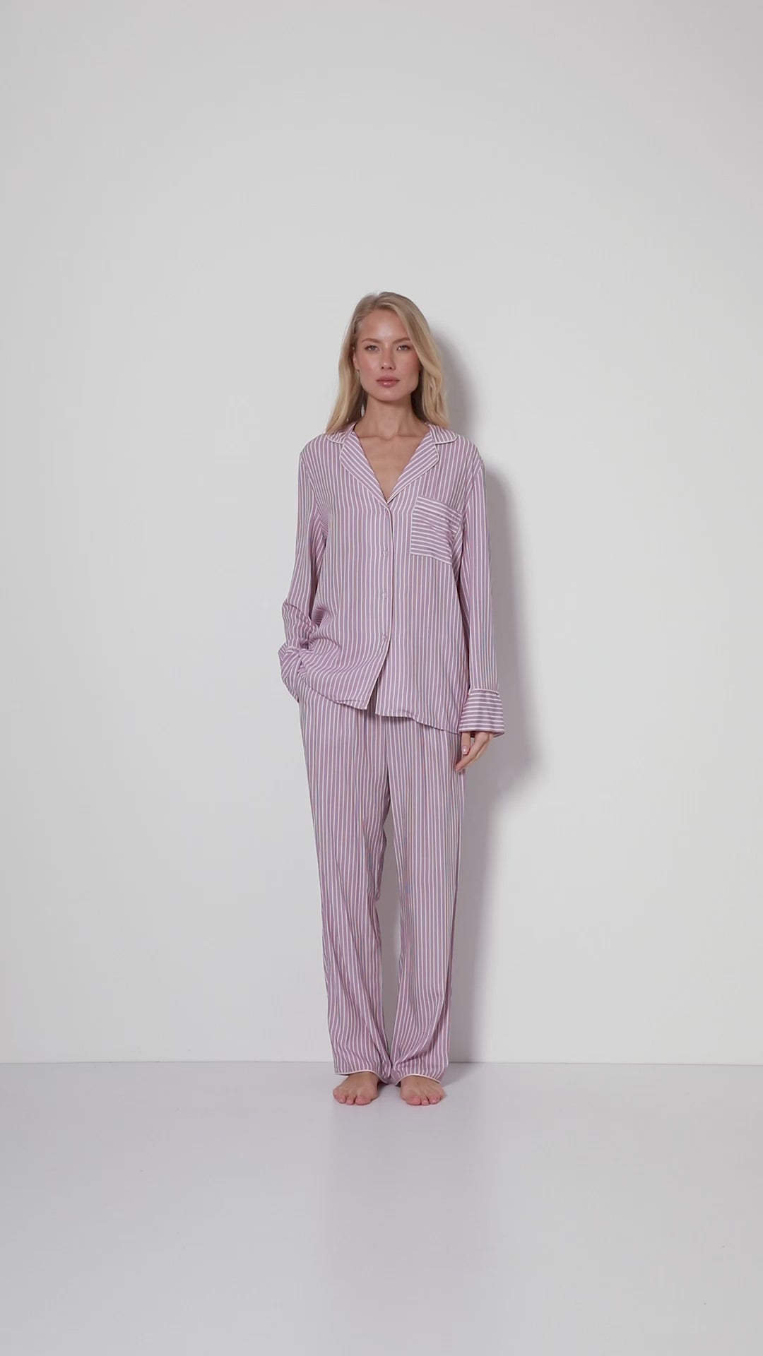 - Piping details accent the neck, pocket, cuffs, and the bottom edge of the pants.