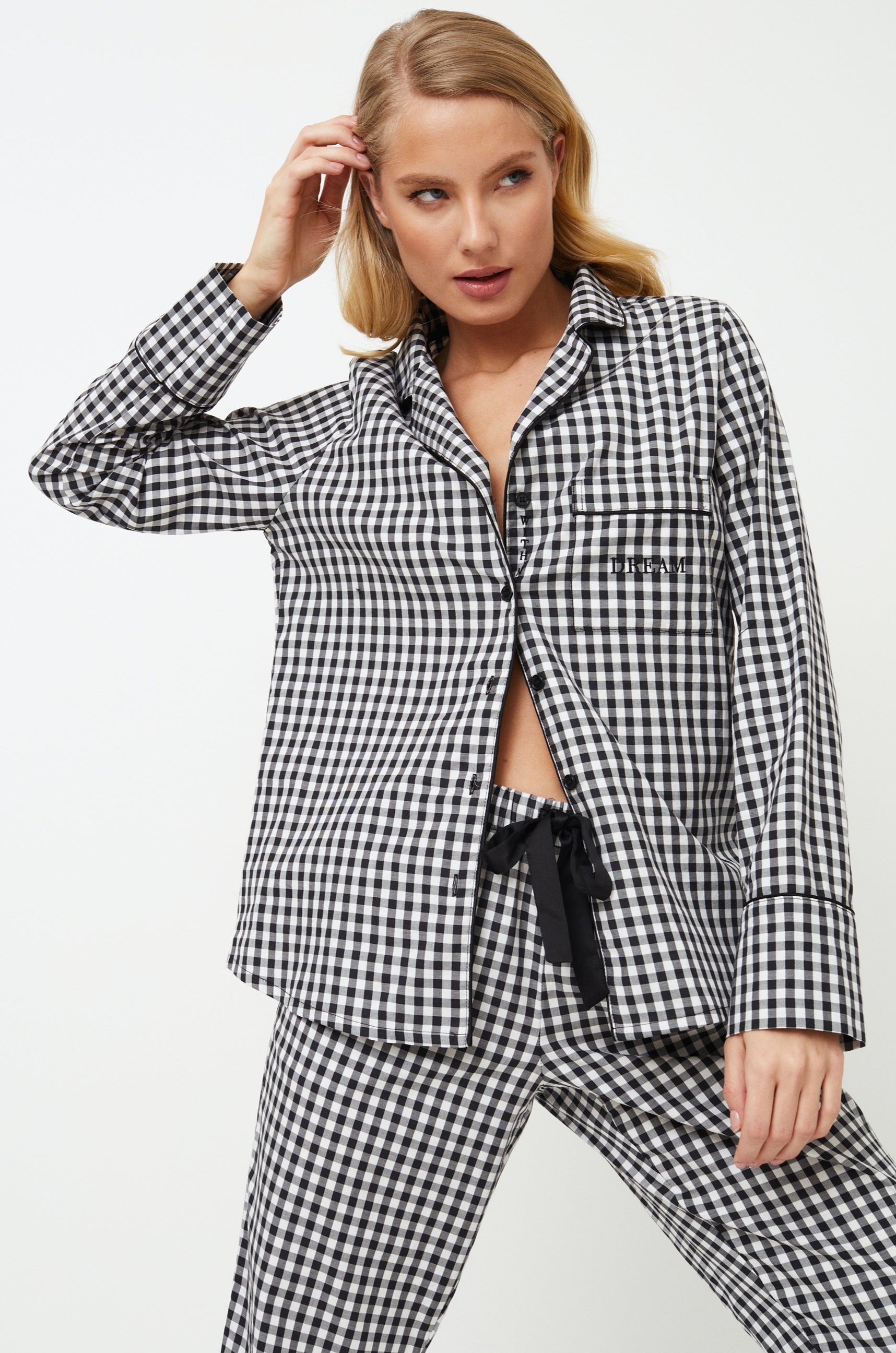 - The long-sleeved shirt features a v-cut collar, a pocket decorated with "Dream" embroidery, also the buttoned-down top reveals hidden embroidery "with me" between the buttons, adding a whimsical twist to your bedtime flair.