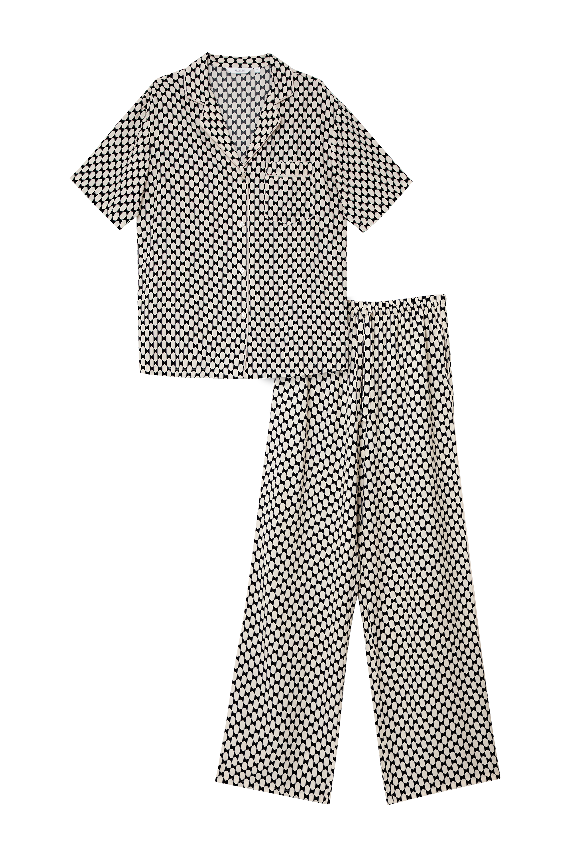 - The set includes a short-sleeve button-up shirt and wide-leg pants.
