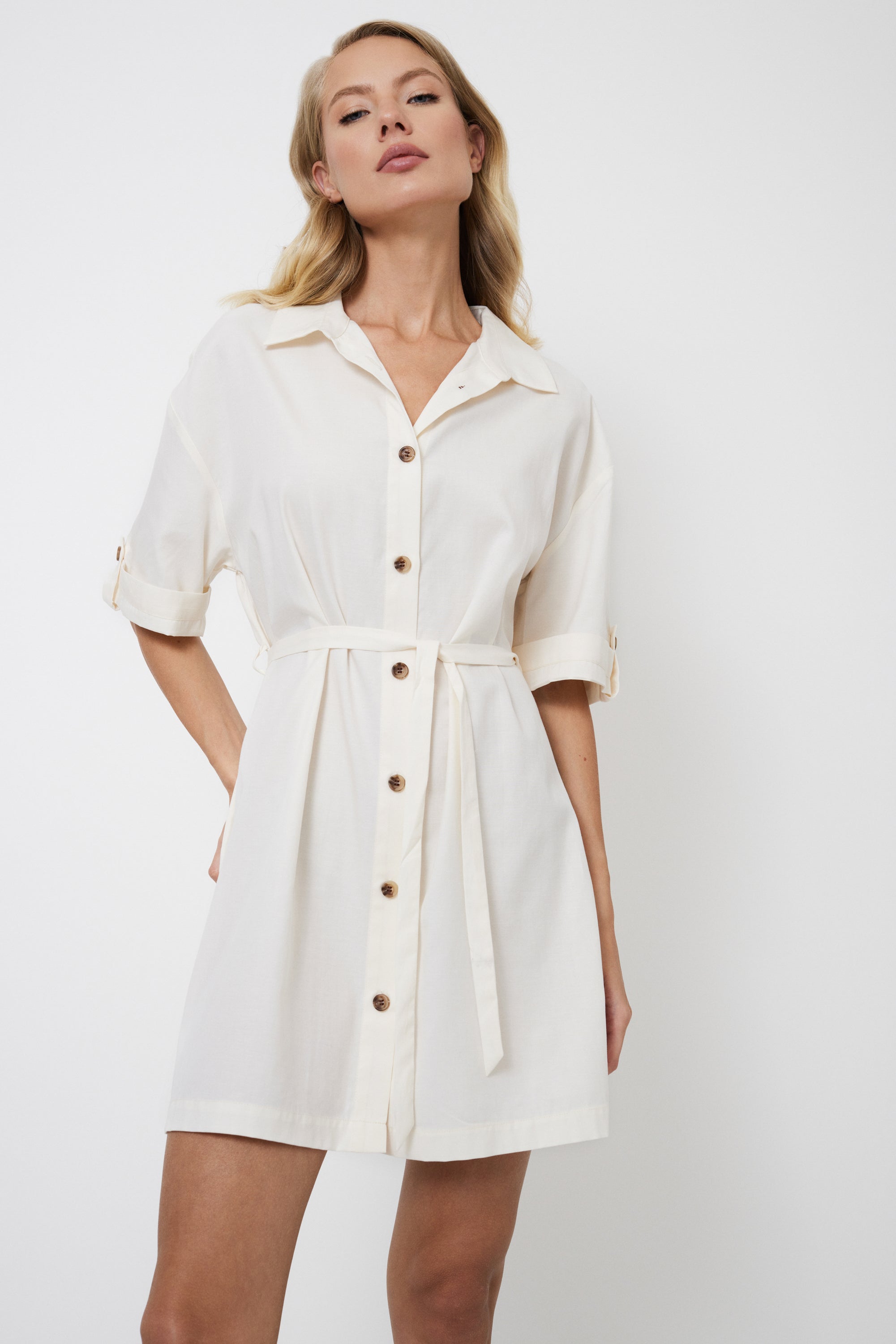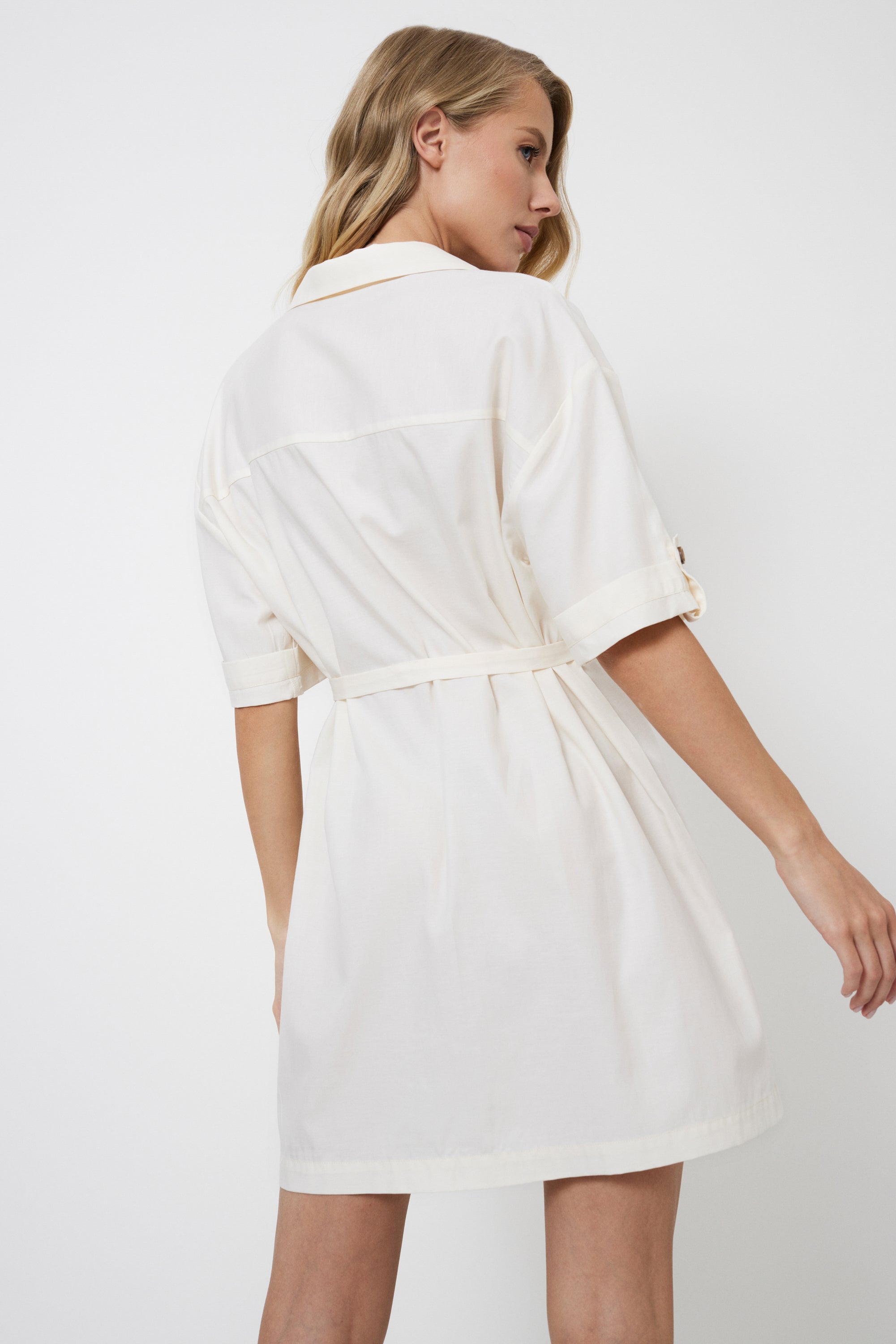 • Folded sleeves with belts add a touch of sophistication.