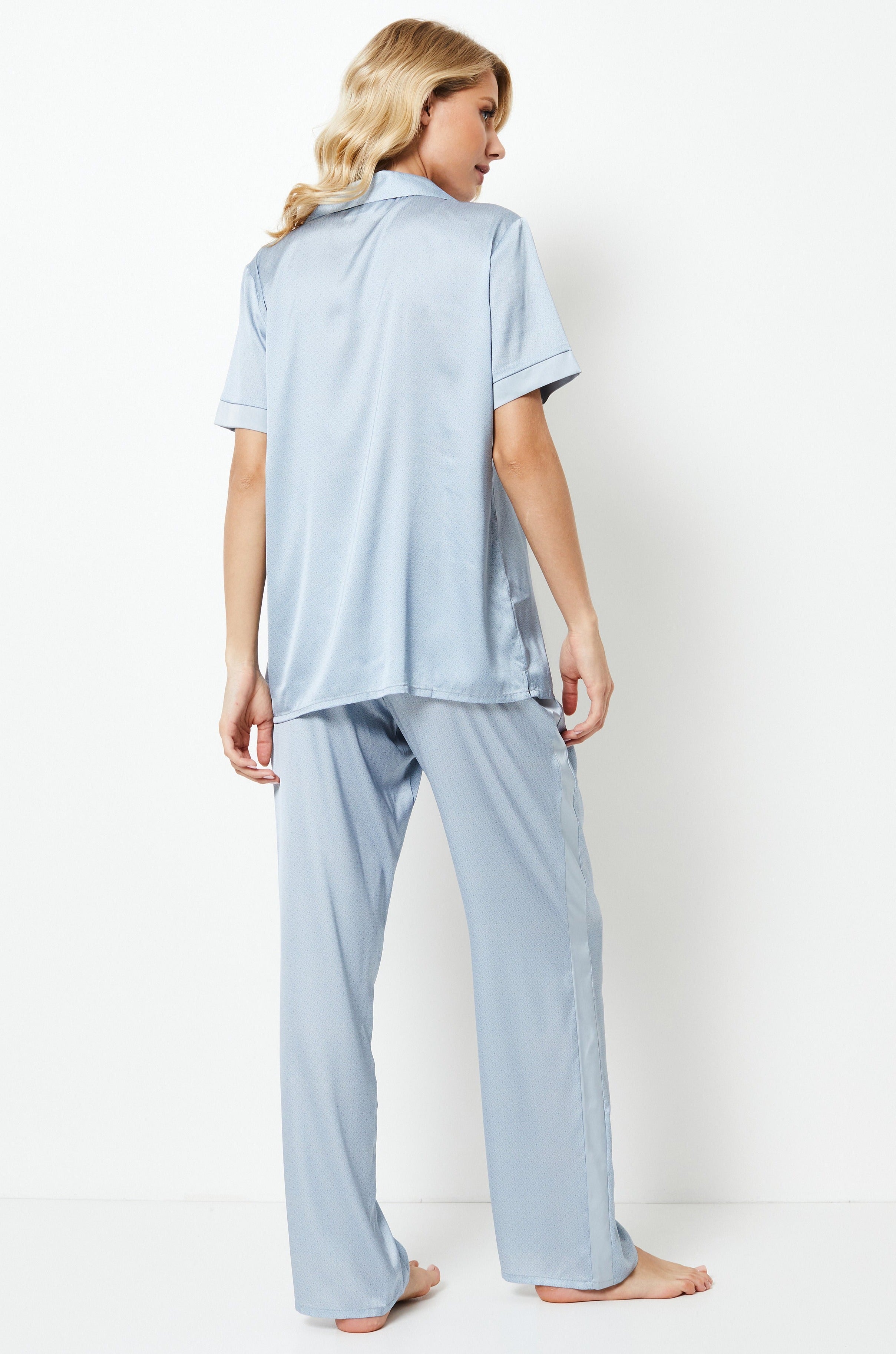 - This pajama set, exquisitely crafted from satin with a silky finish, displays an elegant muted blue geometric pattern.