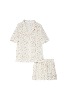 - The set includes a short-sleeve button-up shirt and matching shorts.