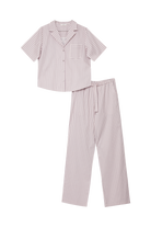 Timeless and soft, this striped pale pink pajama set is ideal for stylish lounging or bedtime comfort.