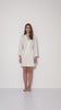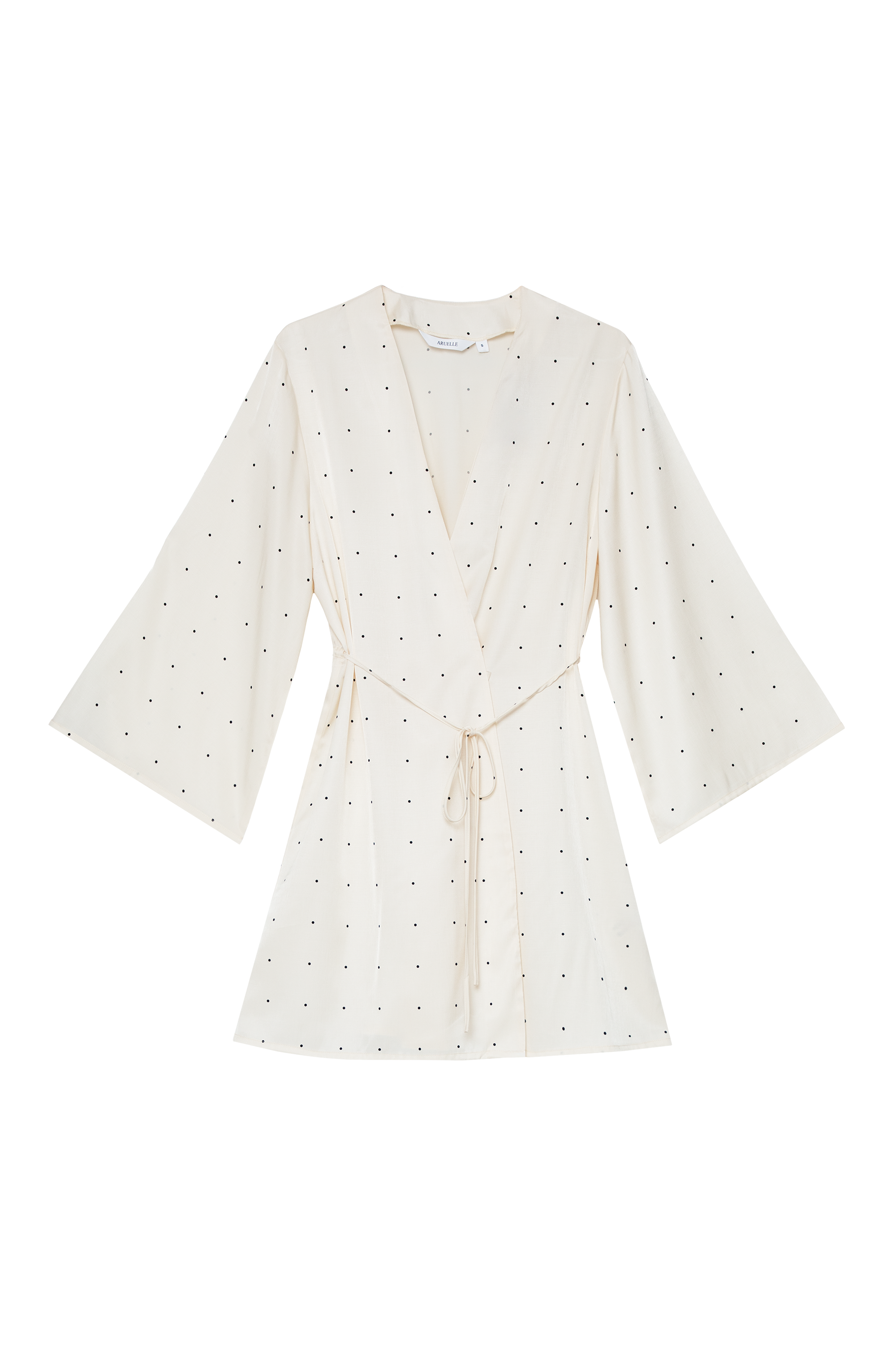 Short wrap-style gown featuring a V-neckline and flared sleeves.
