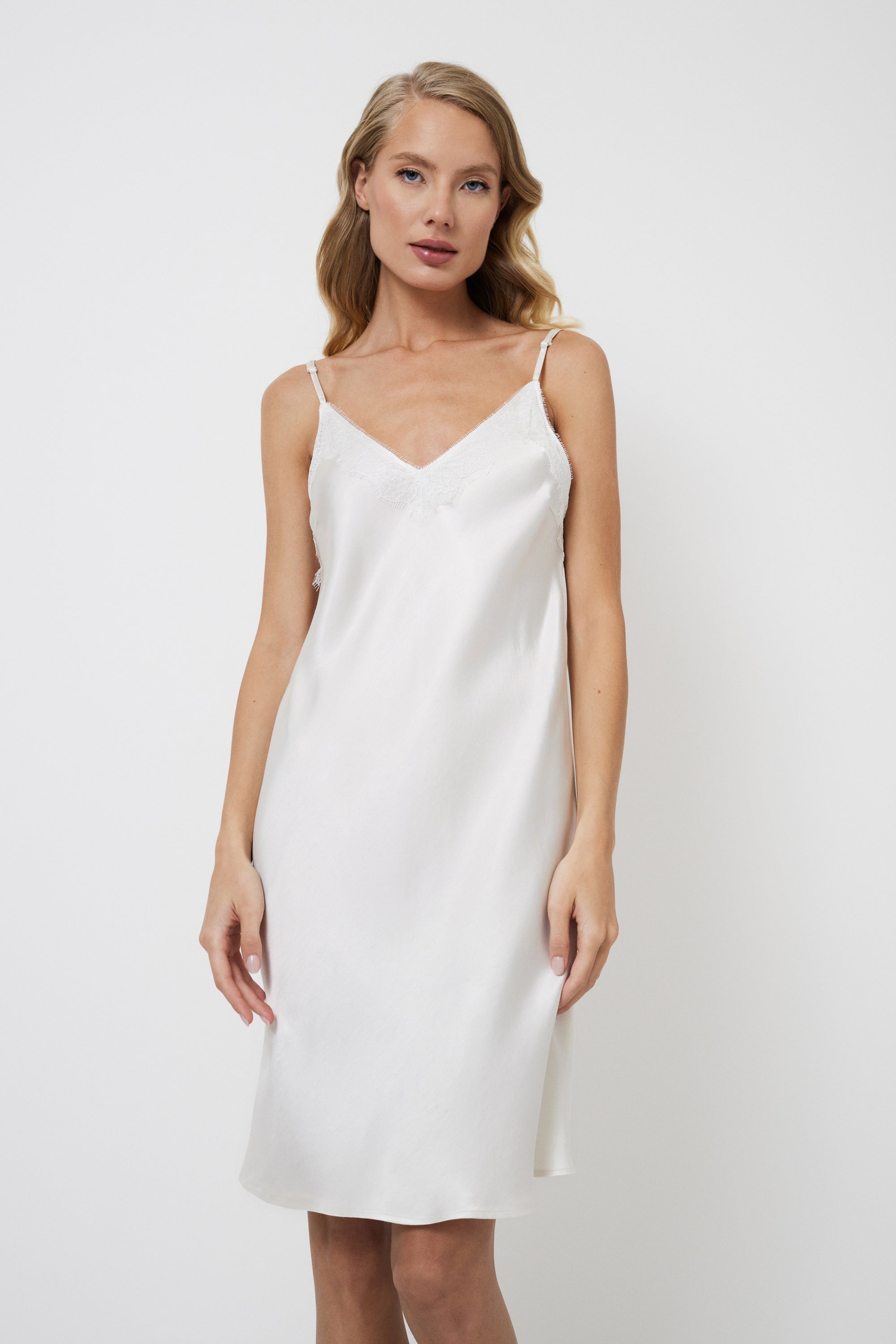 - V formos iškirptė, puošta subtiliais nėriniais.