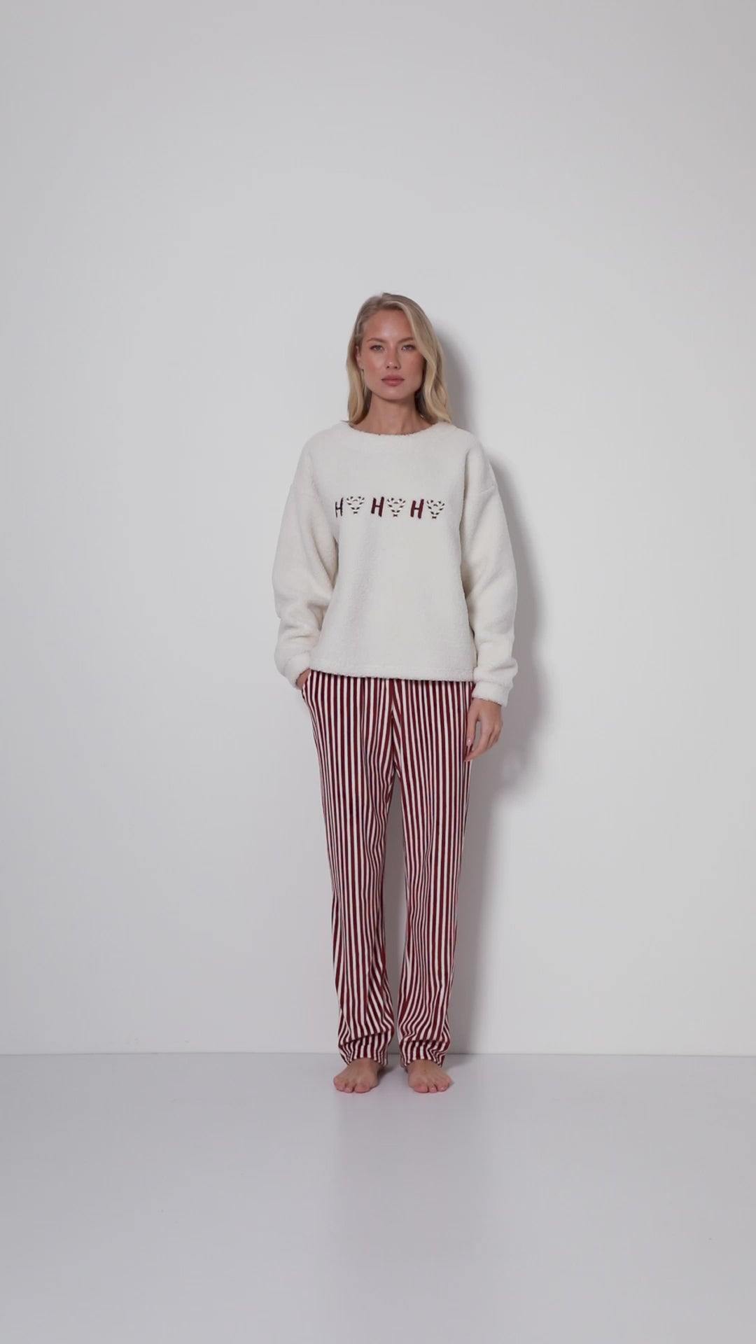 Šventinis ir jaukus namų drabužių komplektas su kelnėmis.
