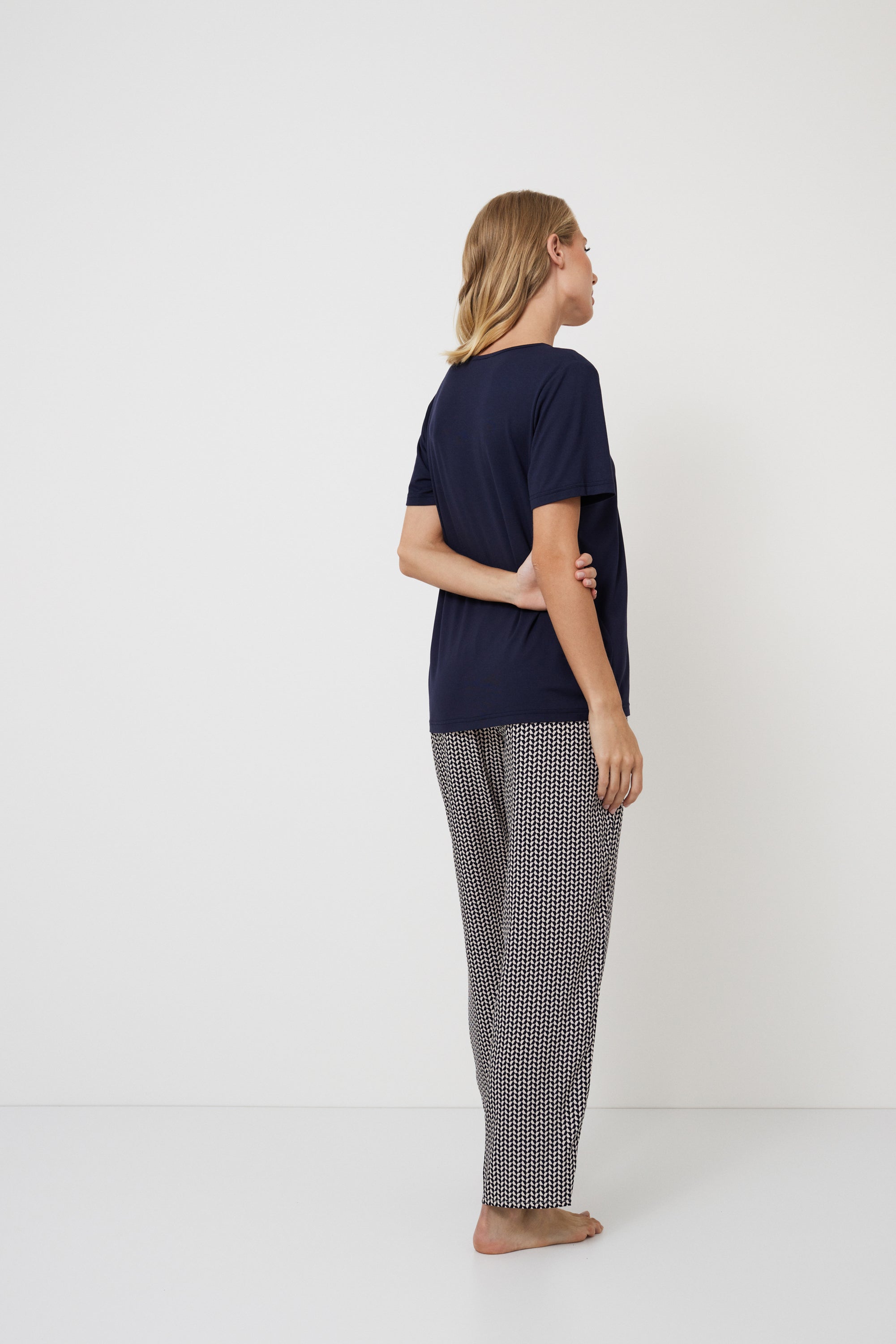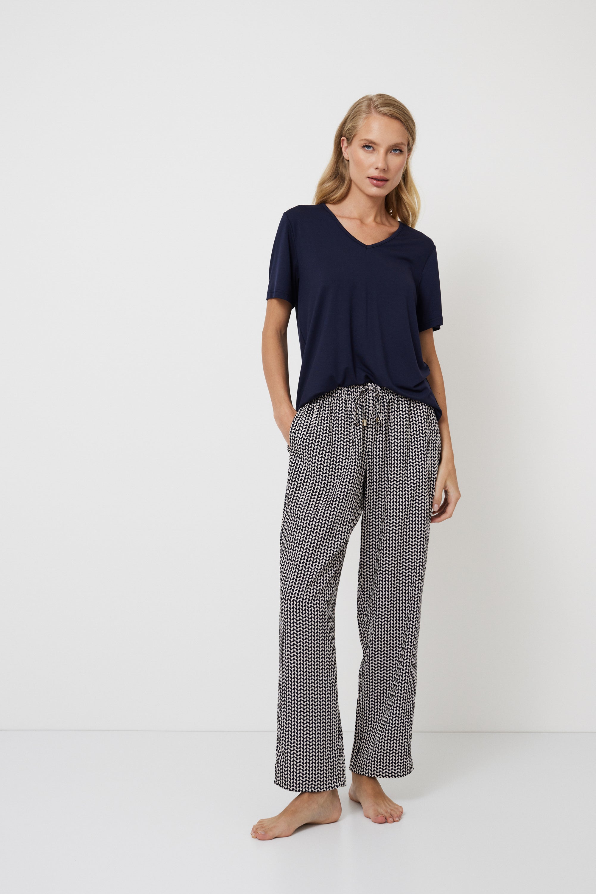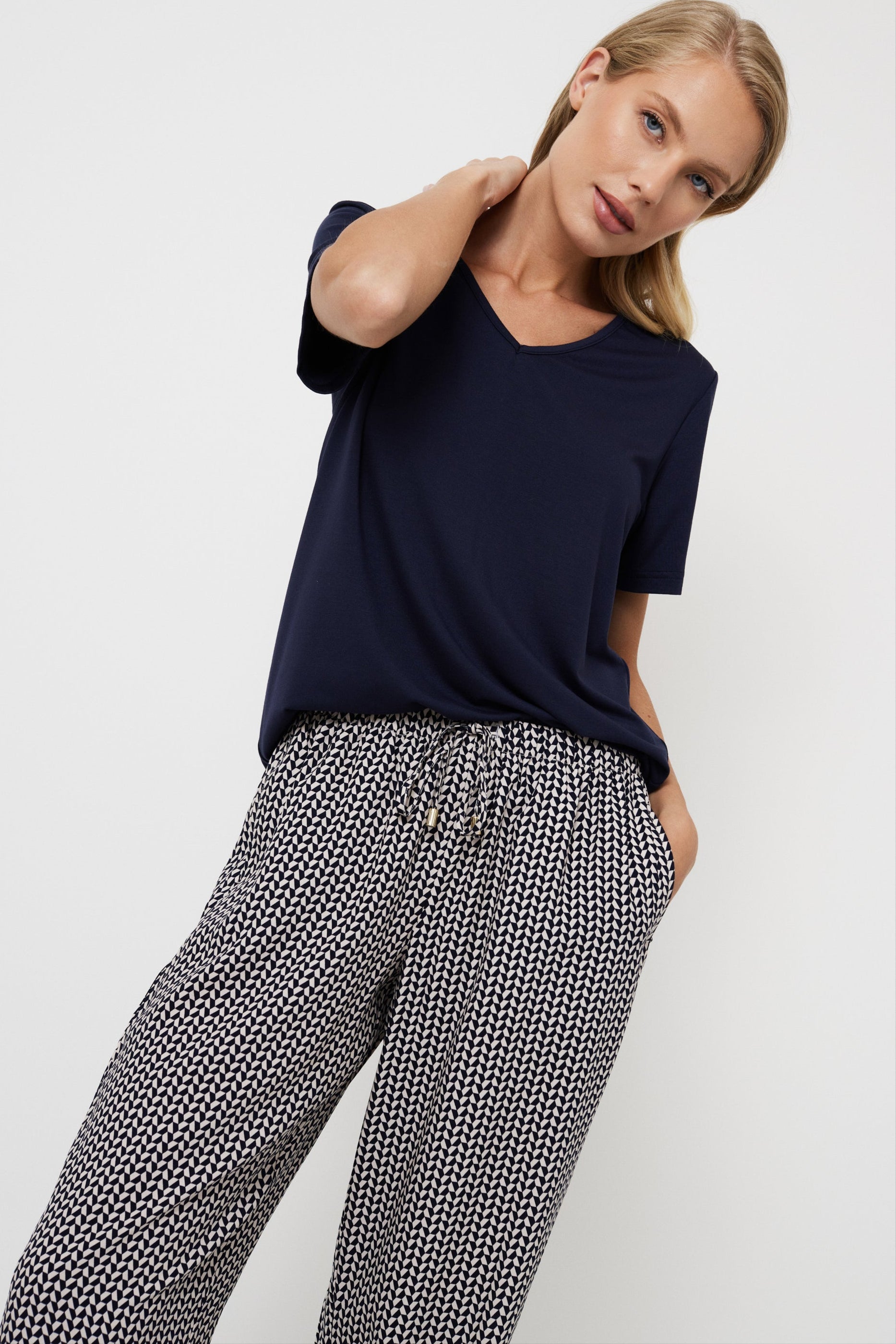 - Lengvos viskozės kelnės su subtiliu mėlynos ir kreminės spalvos geometriniu raštu.