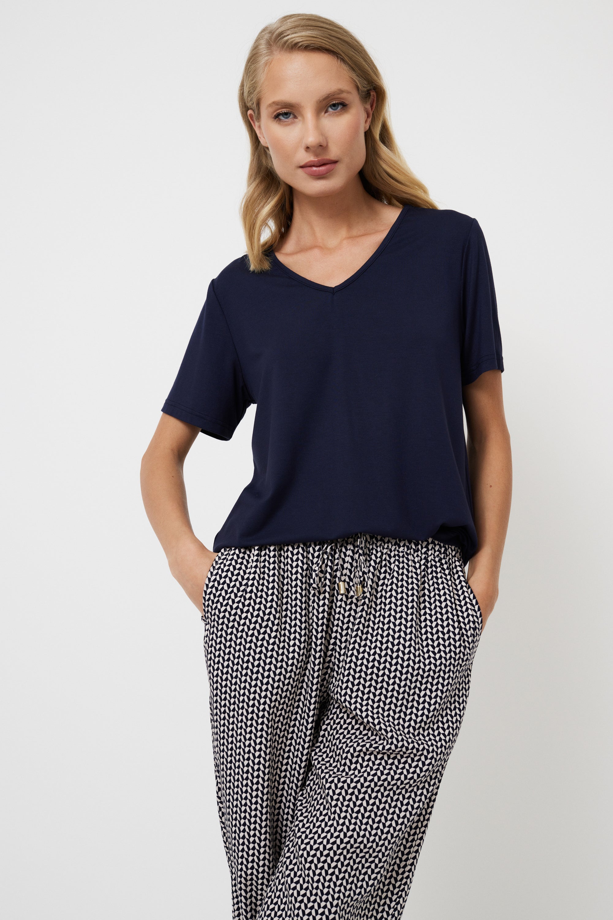 - Klasikinio silueto trumpų rankovių palaidinė su dailia V formos iškirpte.