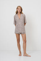 - Sagomis užsegama trumpų rankovių palaidinė su apvalinta V formos iškirpte.