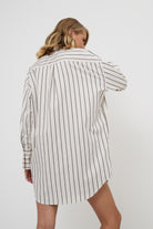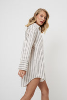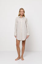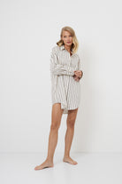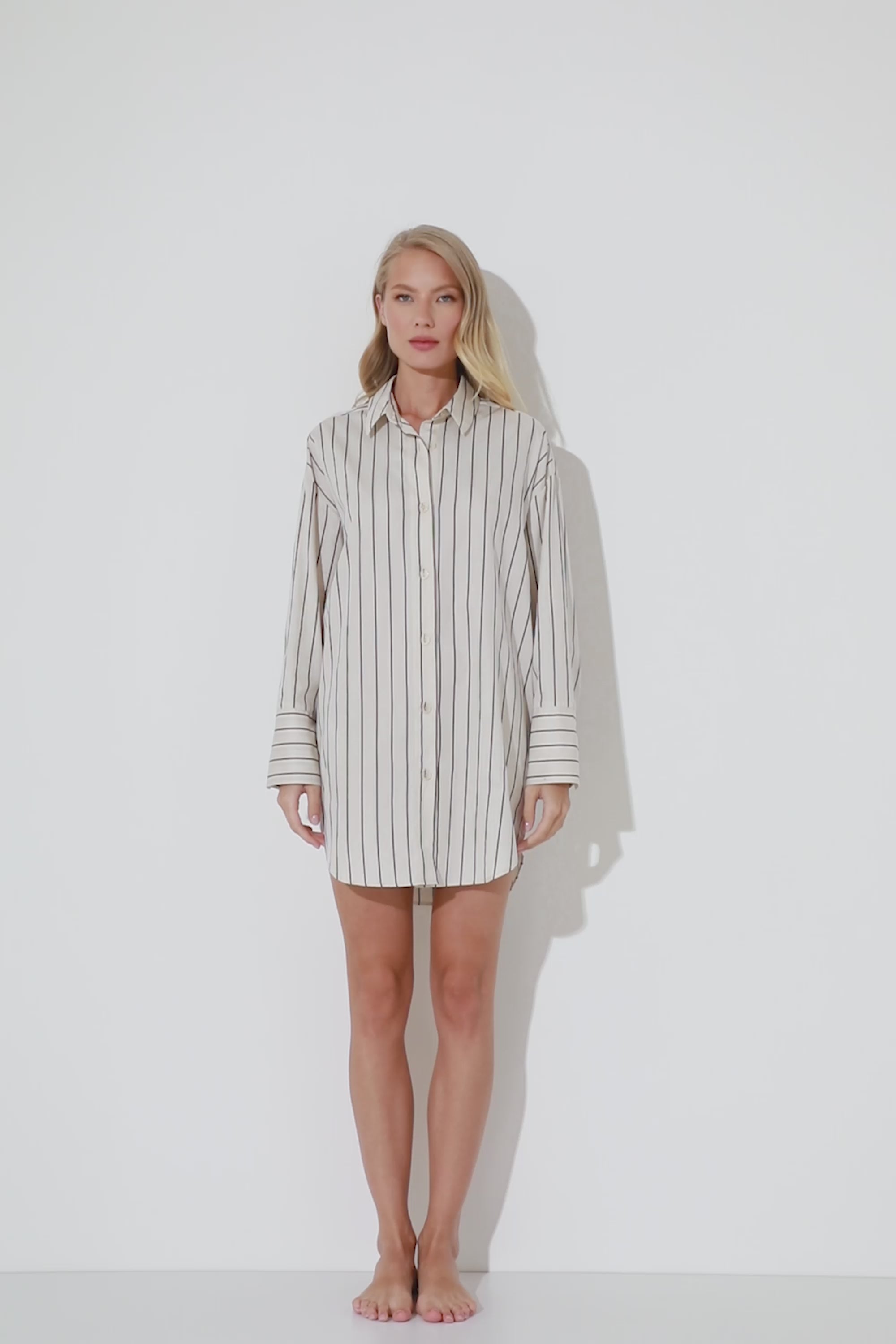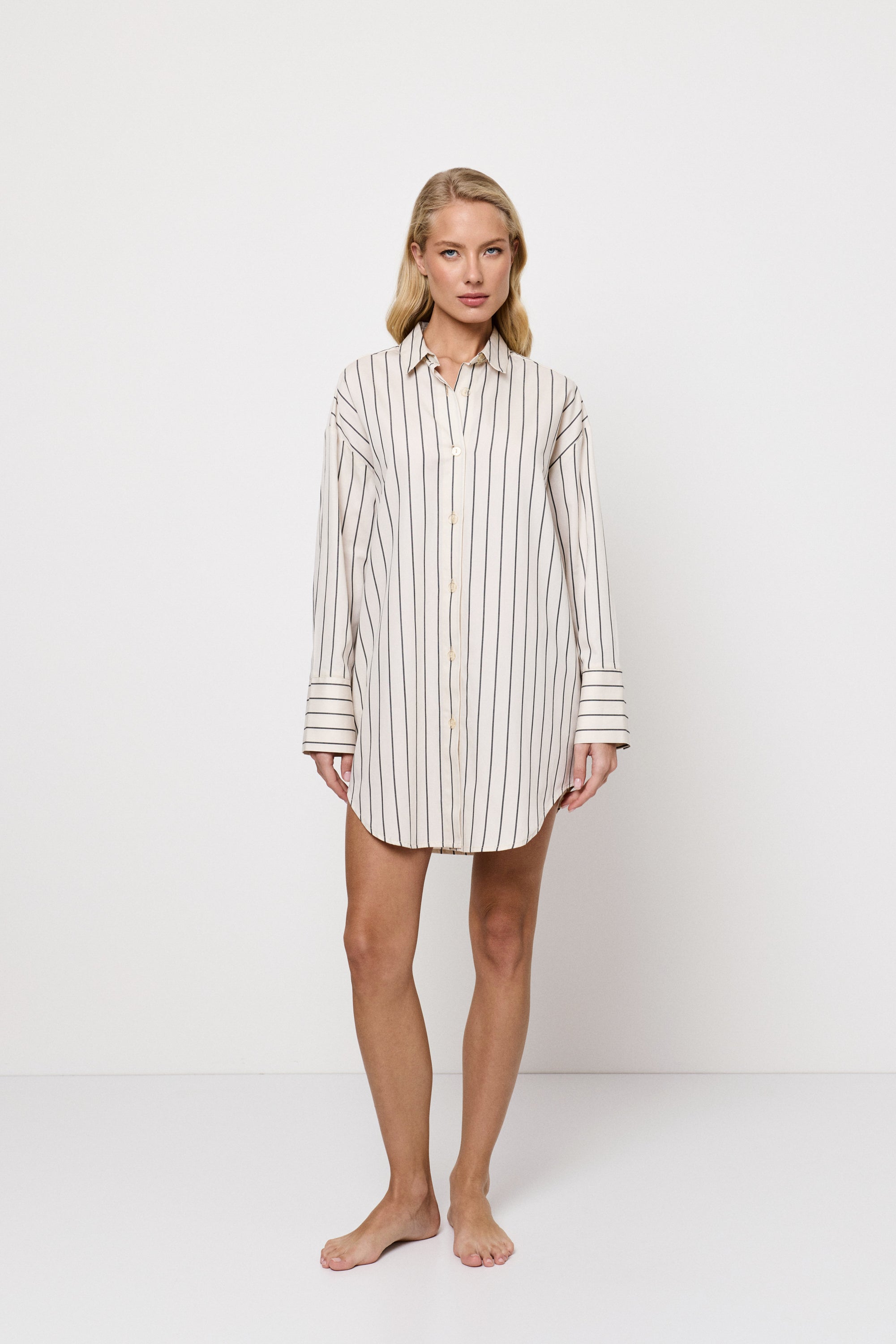 - Ekru spalvos audinys su juodomis juostelėmis kuria klasikinį, žavų raštą.