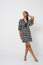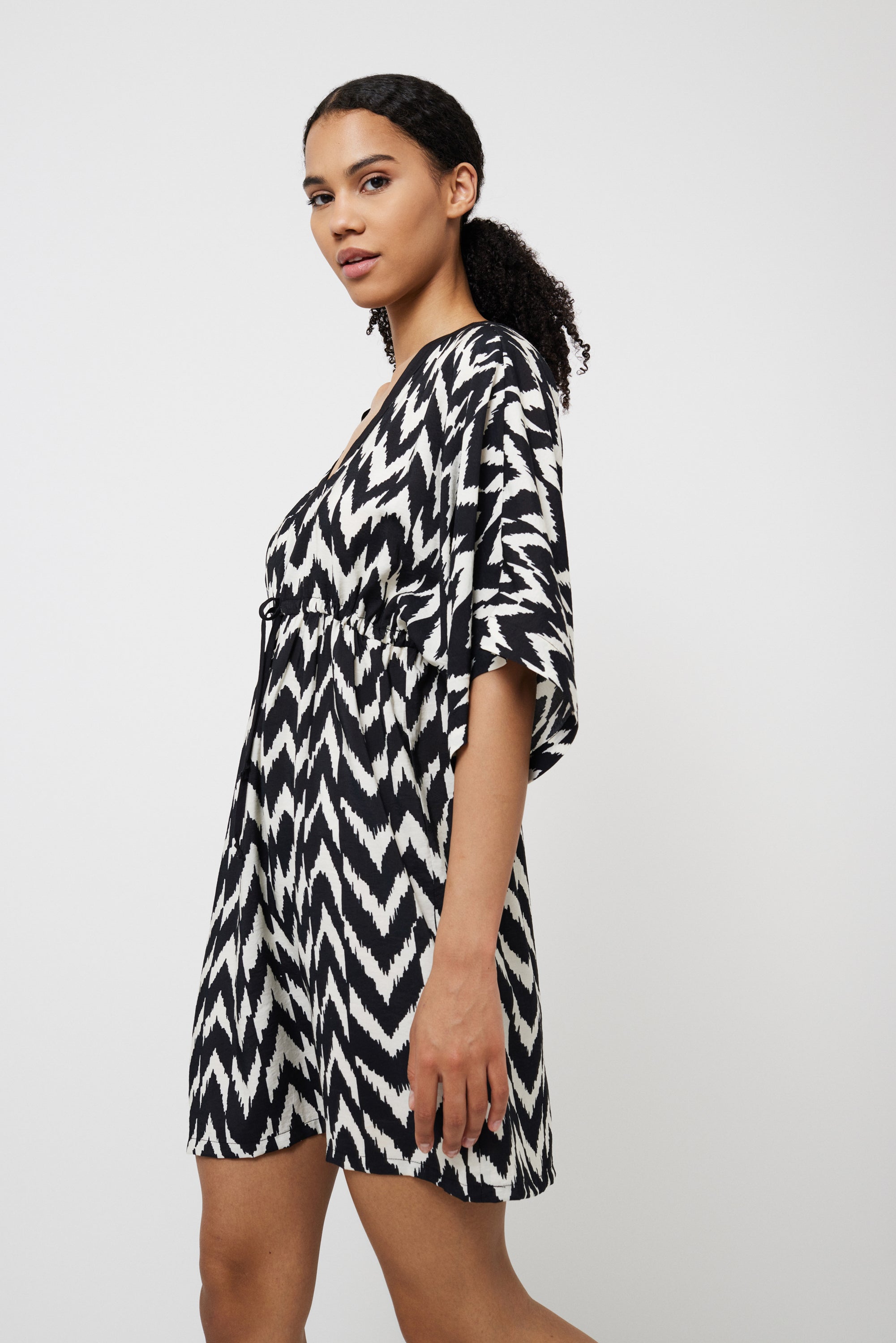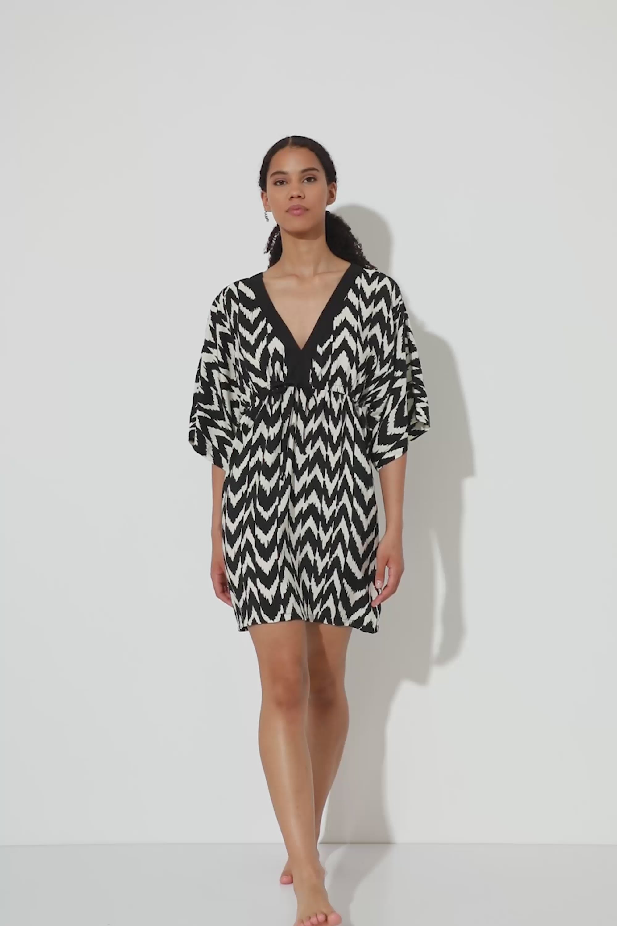- Juodos ir baltos spalvų kimono stiliaus siluetas spinduliuoja nesenstančią rafinuotą estetiką.