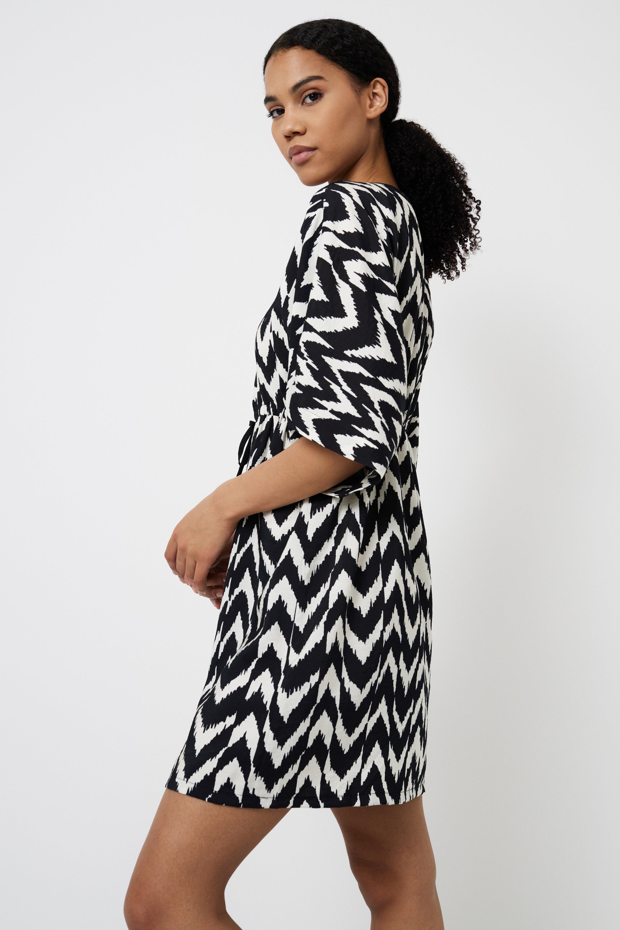 - Kontrastingi juodi akcentai ties iškirpte, rankovėmis ir diržu subtiliai pabrėžia dizaino išskirtinumą.